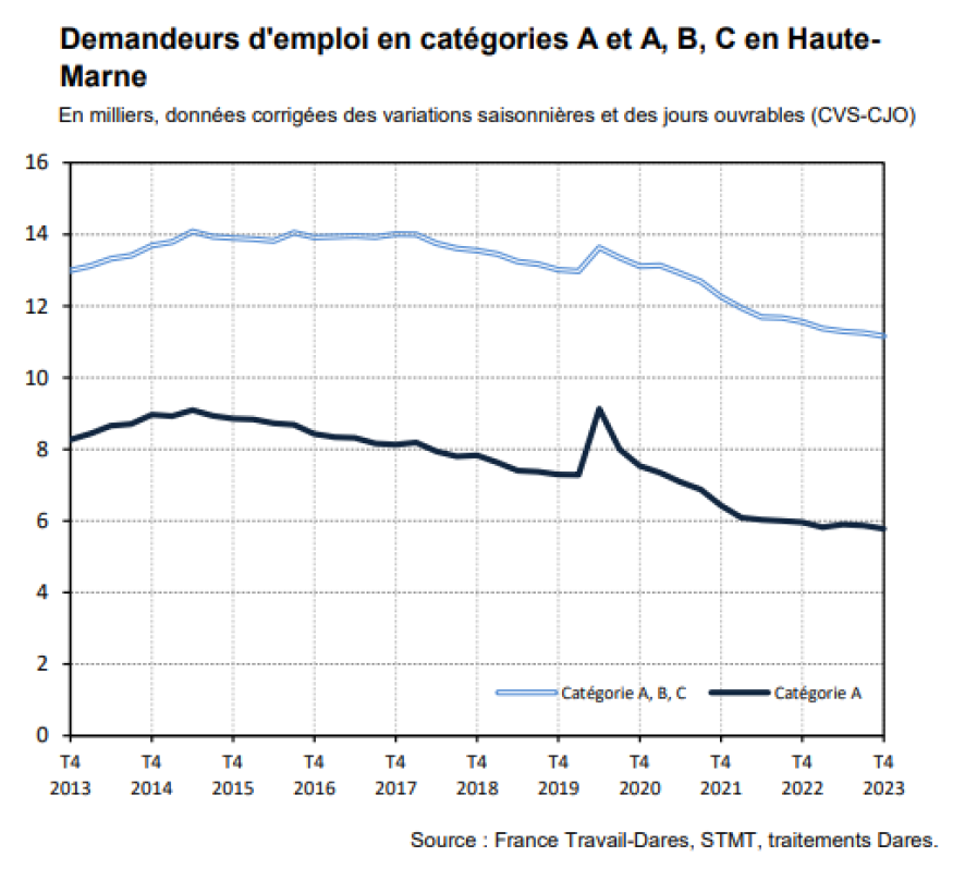 Selon les derniers chiffres de la direction régionale, de l'économie, de l'emploi, du travail et des solidarités, au quatrième trimestre 2023, en Haute-Marne, le nombre de demandeurs d’emploi tenus de rechercher un emploi et sans activité (catégorie A) s'établit en moyenne sur le trimestre à 5 780.