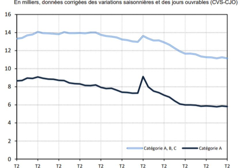 Au deuxième trimestre 2024, en Haute-Marne, le nombre de demandeurs d’emploi tenus de rechercher un emploi et sans activité (catégorie A) s'établit en moyenne sur le trimestre à 5 820. Ce nombre baisse de 0,9 % sur un trimestre (soit –50 personnes) et de 1,0 % sur un an.Dans le Grand Est, ce nombre est stable sur un trimestre (+0,7 % sur un an).